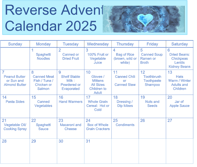 Beginning Monday, Dec. 1, we suggest CHUM’s highly requested items to help our neighbors in need. You can purchase these selections, or other non-perishable food items. Then bring your donations to church and place them in the CHUM baskets, or bring them in a container of your own.