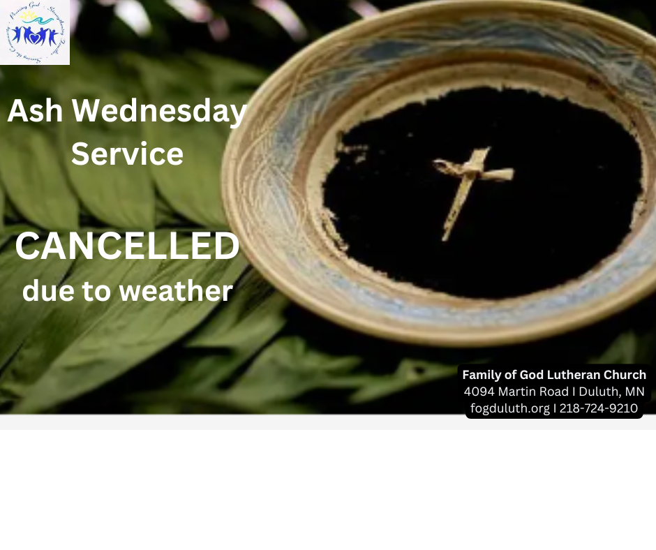 Ash Wednesday Service is cancelled due to weather. Be safe!